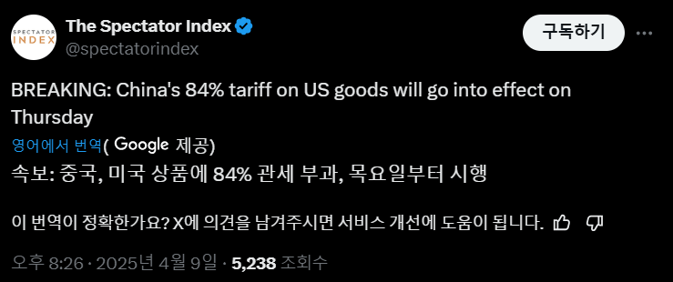 이에 맞서 중국은 미국산 수입품에 대한 관세를 기존 34%에서 84%로 인상한다고 발표했습니다. 이 조치는 4월 10일부터 발효되며, 중국은 트럼프 정부의 정책을 “일방적 협박”으로 규정하고, 끝까지 맞설 것이라고 천명했습니다.