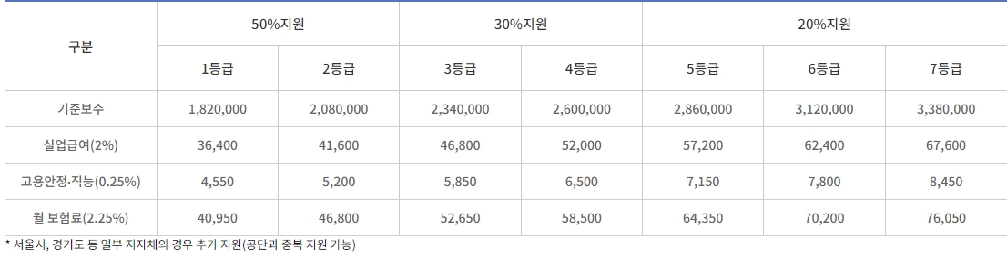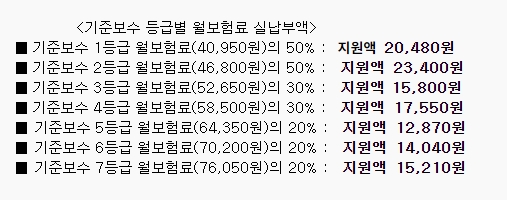 1등급 월보험료의 50%인 20,480원 / 2등급 월보험료의 50%인 23,400원 / 3등급 월보험료의 30%인 15,800원 / 4등급 월보험료의 30%인 17,550원 / 5등급 월보험료의 20%인 12,870원 / 6등급 월보험료의 20%인 14,040원 / 7등급 월보험료의 20%인 15,210원 지원받게 됩니다.